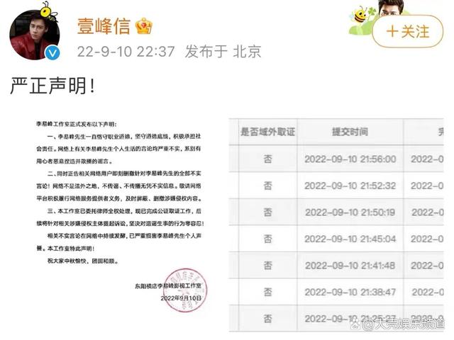 晚上十點(diǎn)多,李易峰工作室率先發(fā)文,工作室曬出了一張蓋有公章的聲明,稱李易峰一直恪守職業(yè)道德,堅(jiān)守道德底線,網(wǎng)傳的言論與事實(shí)嚴(yán)重不符。